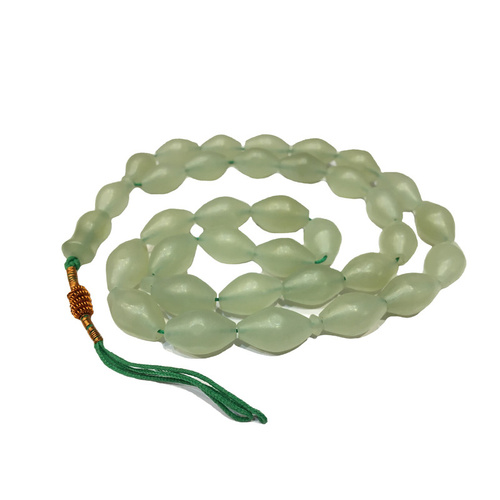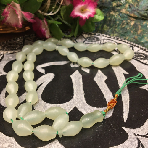 تسبیح شاه مقصود اصل برای معادن مختلف کشور افغانستان می باشد که رنگ های متفاوتی دارد. اینکه برخی میگویند شاه مقصود اصل زرد است یا شاه مقصود اصل فقط سبز است یا فقط انگوری است تفکر اشتباهی است که میان مردم رایج شده است. شاه مقصود چندین رنگ مشخص دارد و تمام این رنگ ها هم همگی اصل افغانی هستند. سنگ یشم انواع مخصوص به خودش را دارد و به یکی از نوع خاص آن شاه مقصود گفته می شود. اکثرا شاه مقصود را به رنگ زردش می شناسند اما به غیر از رنگ زرد، رنگ های سبز روشن، قرمز، نباتی و سیاه طیف رنگی موجود برای سنگ شاه مقصود هستند. شاه مقصود را می شود از کوه های پیرامون شهرقندهار افغانستان که مقبره ی امام زاده ای ملقب به شاه آقا هم در همان نزدیکی قرار دارد، استخراج کرد. سنگ شاه مقصود در واقعیت نام اصلی اش تحت تاثیر فردی به نام مسعود شاه، شاه مسعود بوده است. مسعود شاه از طرف پادشاهان صفوی مامور به حکومت بر ناحیه افغانستان بود و در دوران حکومتش اهمیت زیادی به پیشرفت ناحیهی مجاور امام زاده شاه آقا می داد. هم چنین به ظاهر مقبره ی امام زاده هم سر و سامان داد. از همین رو به پاس زحماتش نام سنگ های استخراج شده از دل آن کوه های نزدیک امام زاده را شاه مسعود گذاشتند. استفاده از شاه مقصود برای نگین های انگشتر آن را بسیار زیبا و جذاب می کند. اما ویژگی های خاص شاه مقصود آن را بسیار مناسب برای استفاده به عنوان دانه های تسبیح کرده است. در اعتقادات مسلمانان ثواب و فضیلت معنوی خاص تسبیح های شاه مقصود قابل مقایسه با نوع دیگر تسبیح ها نیست. خواص مخصوص شاه مقصود: شاه مقصود را سمبل صلح می گویند. تاثیر مثبتی که شاه مقصود بر افراد می گذارد و توجیه علمی هم برای اثبات آن وجود دارد، این است که تمام انرژی های مثبت فضا را به سمت وی جذب می کند و مانع از تاثیر گذاشتن نیروهای منفی آزار دهنده در انسان می شود. تنش ها و اضطراب هایی که گاها انسان ها دچارش می شوند با استفاده از شاه مقصود کاملا خنثی می گردند و شخص به حالت تعادلی و رضایت بخشی می رسد. این تسبیح همراه یک عدد همیان و پک چرمی داخل عکس تحویل میگردد.