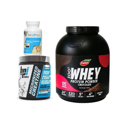 خرید اینترنتی پودر پروتئین شکلات کاله پرو - 1800 گرم به همراه پودر کراتین میکرونایز بی پی آی - 300 گرم به همراه سافت ژل امگا 3 1000 میلی گرمی نکستایل ویتامینز بسته 60 عددی